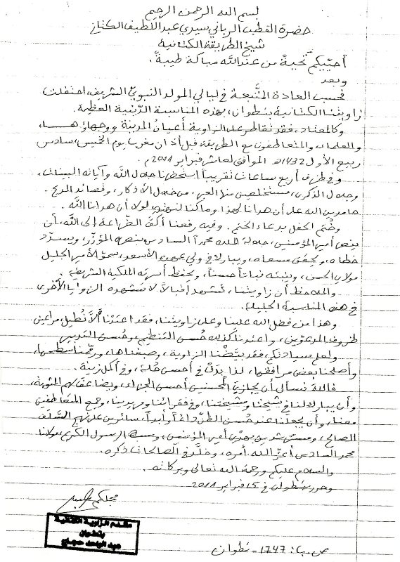 نموذجان من الرسائل الواردة على المشيخة في موضوع احتفال مختلف الزوايا الكتانية بالموسم الأكبر والمولد النبوي 1432 هـ /2011 م