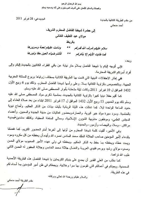 نموذجان من الرسائل الواردة على المشيخة في موضوع احتفال مختلف الزوايا الكتانية بالموسم الأكبر والمولد النبوي 1432 هـ /2011 م